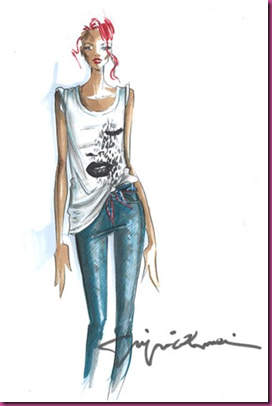 Already the face of both brands, the singer’s debut offering features T-shirts bearing her R logo and Armani’s signature eagle, classic biker jackets, a canvas rucksack, jeans in two different styles and sets of lace underwear that come in navy blue and pearl grey.